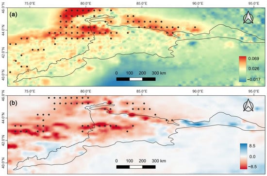 Climate tendency in the Tianshan Mountains from 2000 to 2021. (a) Interannual tendencies of MAT (℃ yr−1) and (b) PRE (mm yr−1) in the Tianshan Mountains. Areas marked with black dots indicate statistically significant trends at the 95% confidence level.
