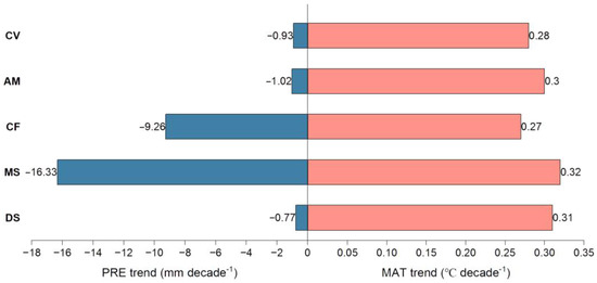 The MAT and PRE trends in different altitudinal vegetation belts were consistent. Although divergent altitudinal vegetation belts showed slight warming (p > 0.05), the warming trends varied: they were higher in the lower elevation vegetation belts (i.e., DS and MS) than in the higher elevation belts (i.e., CF and CV) (Figure 4). Despite the minimal disparity in warming magnitude among all vegetation belts, the lower-elevation vegetation belts exhibit a slightly higher warming trend compared to their higher-elevation counterparts. Moreover, precipitation has slightly decreased across all altitudinal vegetation belts: MS and CF had the largest drying trend (−16.33 and −9.26 mm decade−1), and CV and DS had the smallest (below 0.7 mm decade−1).