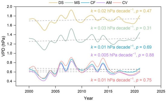 Over the course of the study period, there was no significant trend in the VPD among various vegetation belts at different altitudes. Based on Figure 5, slightly increasing trends in VPD were observed across all altitudinal vegetation belts. Among them, DS and MS exhibited a higher rate of increase compared to other vegetation belts. However, AM did not show obvious inter-annual variation in VPD. It is important to note that the VPD trends in all vegetation belts did not meet the criteria for statistical significance.