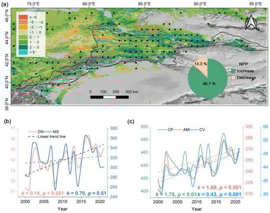 Spatial and temporal variations in growing season NPP from 2000 to 2021. (a) Spatial patterns of NPP trends (unit is g C m−2 yr−1) during the study epoch in the Tianshan Mountains. The interpretation of the black dots in the figure remains consistent with that in Figure 6. (b) Interannual variability in regional mean GPP (y-axis unit is g C m−2 yr−1) in lower elevation altitudinal vegetation belts. (c) Interannual variability in regional mean GPP (y-axis unit is g C m−2 yr−1) in higher elevation altitudinal vegetation belts.