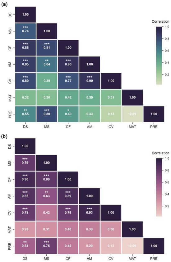 Correlation matrix plot of climatic variables and growing season vegetation productivity. (a) Correlation coefficients of GPP and climate variables for different altitudinal vegetation belts. (b) As in panel (a), but for NPP. Asterisks indicate that the correlation passed the significance test: p < 0.05 *, p < 0.01 **, p < 0.001 ***.