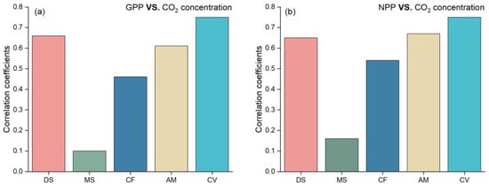 Elevated CO2 concentration can lead to increased productivity in vegetation. Solar radiation mainly regulates vegetation productivity changes in humid areas (higher cloud cover and water vapor content) []. Hence, the influence of solar radiation on the interannual trends of vegetation productivity in the altitudinal vegetation belts is not a topic that will be discussed. The consumption of fossil energy sources increases the concentration of atmospheric CO2, which contributes to global warming while stimulating photosynthesis in plants (CO2 fertilization) []. In general, CO2 fertilization plays a significant role in augmenting the capacity of vegetation to absorb CO2. Existing literature has demonstrated that CO2 fertilization stimulates vegetative growth and facilitates the accumulation of biomass []. Therefore, we further investigated the sensitivity of vegetation productivity in altitudinal vegetation belts to changes in CO2 during the growing season. GPP and NPP variations were significantly and positively correlated with CO2 concentrations in all altitudinal vegetation belts, except for MS (Figure 9a,b). In which the GPP and NPP of CV were more sensitive than those of other areas to changes in CO2 concentration. MS was not sensitive to changes in CO2 concentration because there were no significant changes in GPP or NPP (Figure 6b and Figure 7b). In summary, we conclude that CO2 fertilization played a more important role than precipitation and temperature in determining the interannual trends of vegetation productivity across altitudinal vegetation belts in the study period.