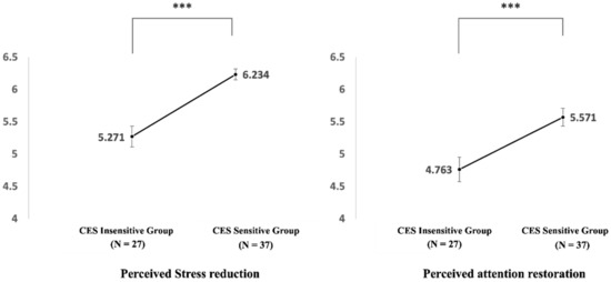 4.4. Differences in Perceived Stress Reduction and Attention Restoration among People with Different CES Sensitivities
