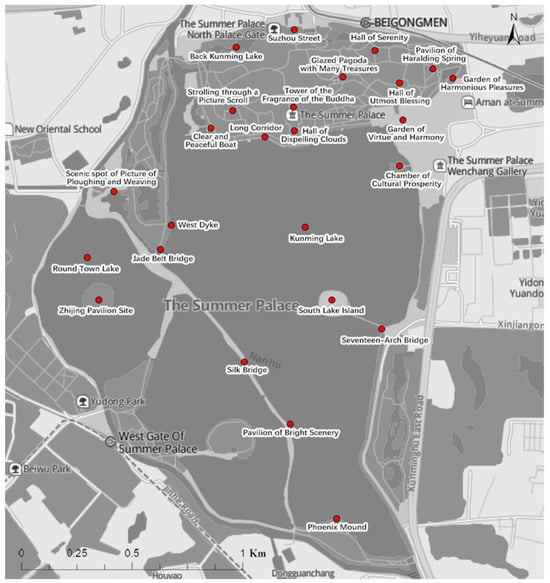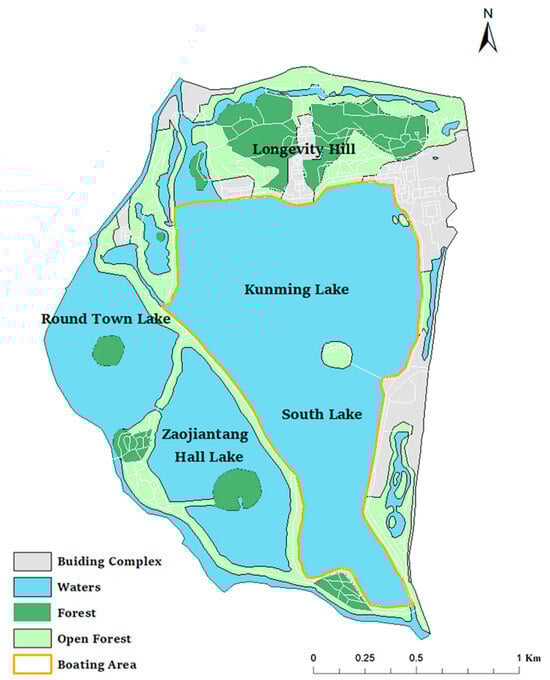 Located in the western suburbs of Beijing, the Summer Palace is a royal garden of the Qing Dynasty in China. It is a large landscape garden built situated on Kunming Lake and Longevity Hill, and West Lake in Hangzhou. It draws on the design techniques of the Jiangnan gardens and is one of the best-preserved royal palaces and imperial gardens. Therefore, it is regarded as the “Museum of the Royal Gardens”. The entire garden covers an area of 3.009 km2, of which the water surface accounts for approximately three quarters of the area. It encompasses a variety of habitats and rich landscape types, which mainly consist of forests, open forests, waters, and architectural complexes (Figure 1). The total number of annual visitors exceeds 15 million. It is one of the most important places in Beijing for the public to come into contact with nature and experience the ecosystem services of urban green spaces.