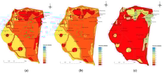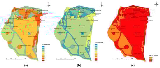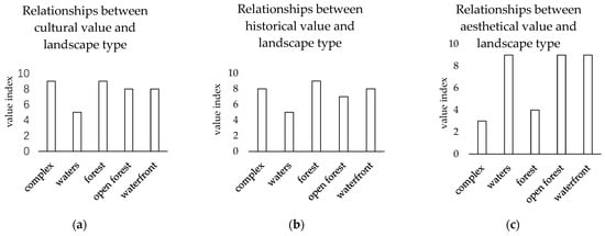 Relationships between each social value of ecosystem services and landscape types in the Summer Palace. (a) Distribution of cultural value in different landscape types in Summer Palace; (b) distribution of historical value in different landscape types in Summer Palace; (c) distribution of aesthetic value in different landscape types in Summer Palace.