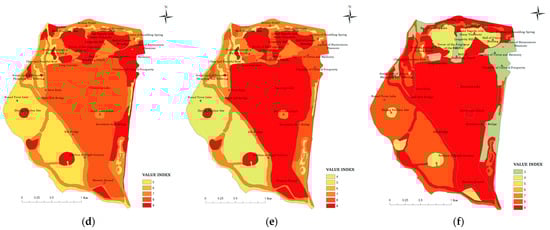 The effects of different environmental values on the spatial distribution of social values among the Summer Palace visitors. (a) Anthropocentrism group—distribution of cultural values in the Summer Palace; (b) anthropocentrism group—distribution of historical values in the Summer Palace; (c) anthropocentrism group—distribution of aesthetic values in the Summer Palace; (d) ecocentrism group—distribution of cultural values in the Summer Palace; (e) ecocentrism group—distribution of historical values in the Summer Palace; (f) ecocentrism group—distribution of aesthetic values in the Summer Palace.