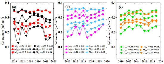 3.1. Annual Soil Moisture Variation at Different Depths for Different Ecosystems