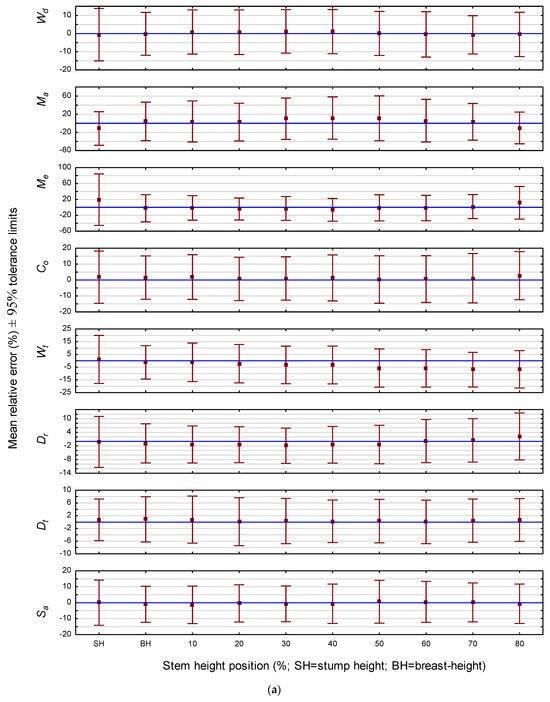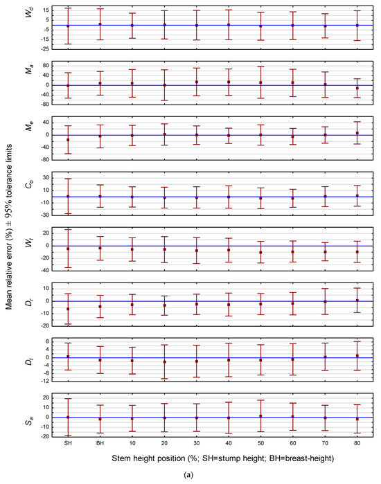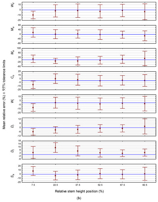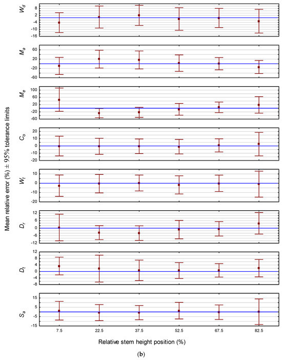 In terms of prediction precision evaluated on a non-positional basis, the attribute rankings for jack pine and red pine were very similar: Dt > Dr > Sa > Wd > Wt > Co >> Me > Ma for jack pine; and Dt > Dr > Sa > Wd > Wt > Co >> Ma > Me for red pine. Specifically for jack pine, the range of the relative error interval for the 10-sample mean estimate would not exceed ±5% for six of the attributes (Dt < Dr < Sa < Wd < Wt < Co) and ±15% for the remaining two attributes (Me < Ma) (Table 4). Similarly, 95% of all future individual prediction errors would be fall within tolerance intervals with ranges of less than ±17% for six of the attributes (Dt < Dr < Sa < Wd < Wt < Co) and ±47% for the remaining two attributes (Me < Ma) (Table 4). For red pine, the range of the relative error interval for the 10-sample mean estimate would not exceed ±4% for six of the attributes (Dt < Dr < Sa < Wd < Wt < Co) and ±25% for the remaining two attributes (Ma and Me) (Table 5). Likewise, 95% of all future individual prediction errors would be fall within tolerance intervals with ranges of less than ±13% for six of the attributes (Dt < Dr < Sa < Wd < Wt < Co) and ±80% for the remaining two attributes (Ma and Me) (Table 5). In order to visually contrast the attribute-specific tolerance intervals for relative error across height positions for each species, whisker plots were deployed: Figure 1a for jack pine and Figure 1b for red pine. As illustrated, the intervals for a given attribute and species are relatively invariant across stem positions. However, exceptions did occur, particularly the intervals for Me for both species at the lowest relative height positions.