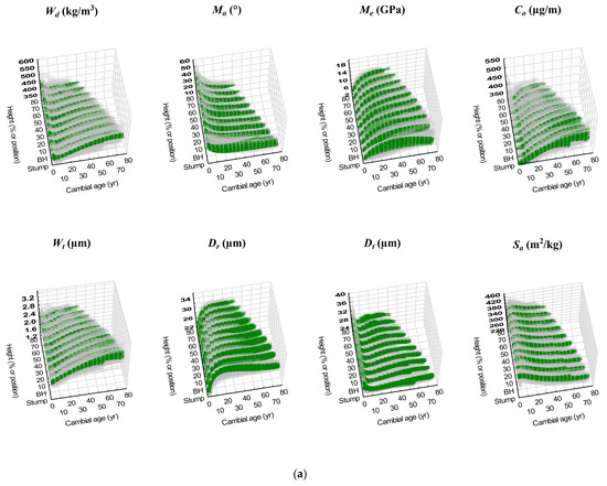 According to the predicted trajectories as displayed within the context of the full data (i.e., Figure 3a for jack pine and Figure 3b for red pine), the trajectories were in general concordance with the observed trajectories in terms of mirroring the overall nonlinear polymorphic temporal trends within the cross-sectional disks, irrespective of height position, attribute or species. Similar to the validation assessment results, the least degree of concordance was observed within the wood density, microfibril angle, modulus of elasticity and fibre coarseness trajectories, particularly within the cross-sectional disks located within the lower bole region. Although predicted spatiotemporal development patterns were similar between the species irrespective of attribute, at a given height position, jack pine exhibited a greater degree of nonlinearity in the Wd and Dt trajectories, whereas red pine exhibited a greater degree of nonlinearity in the Ma, Me, Co, Wt, Dr, and Sa trajectories. However, for both species and irrespective of attribute, the greatest degree of nonlinearity occurred before a cambial age of approximately 30 years.