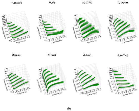where is the cumulative annual ring-area-weighted moving average value up to the ith cambial age (i = 1, …, I; I = cross-sectional total cambial age) specific to the jth cross-sectional disk per tree, kth sample tree and lth attribute (i.e., wood density, microfibril angle, modulus of elasticity, fibre coarseness, tracheid wall thickness, tracheid radial diameter, tracheid tangential diameter or specific surface area); is the mean area-weighed attribute value for the annual ring produced in the ith cambial year specific to the jth cross-sectional disk, kth sample tree and lth attribute; and is the area (mm2) of the annual ring produced in the ith cambial year specific to the jth cross-sectional disk and kth sample tree. As quantitatively expressed via Equation (1), the cumulative moving average is a composite descriptive statistic that accounts for all preceding values of a temporally ordered annual ring attribute sequence. Area-based weighting of the contributions from the preceding annual-rings and carrying forward their influence, computationally dampens the effect of annual variation arising from fluctuations in external growth and development determinates. Thus, the cumulative moving average sequence is more reflective of long-term attribute development trends than other measures of central tendency (e.g., arithmetic mean). Additionally, the metric has inferential utility in terms of reflecting the temporal evolution of end-product potential. For example, the cumulative value for the dynamic modulus of elasticity at the end of a sequence reflects the overall wood stiffness of the tree at that specific stem height position, and hence, by extension, reflects the solid wood end-product potential of that stem region. Collectively, cumulative values provide an inferential framework for identifying and delineating the potential type and associated grade of extractable end-products (e.g., [9]).