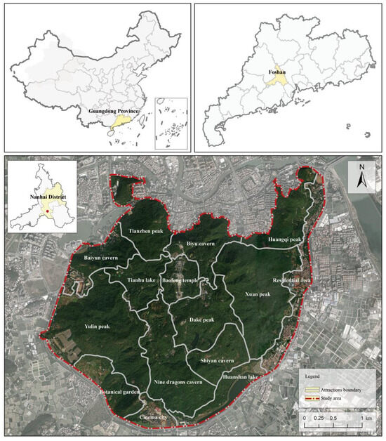 Xiqiao Mountain National Forest Park is located in the southwestern region of the Nanhai District, Foshan City, Guangdong Province, China, covering an area of approximately 1304.84 hm2 (22°55′–22°57′ N, 112°56′–113°0′ E). Over time, it has received prestigious designations, including “National Scenic Area”, “National Geological Park”, and a “National 5A-Level Tourist Attraction”. The park is situated in the south subtropical monsoon climate zone, characterized by mild winters, cool summers, temperate conditions throughout the four seasons, and abundant rainfall. It maintains an average annual temperature of 21.8 °C and an annual average precipitation of 1638.5 mm. The park boasts rich vegetation, primarily comprising subtropical evergreen forests, with a diverse range of over 800 plant species and more than 95% forest coverage. The dominant tree species in the park include Ficus concinna, Ilex rotunda, Schima superba, Castanopsis fissa, Castanopsis carlesii, Bombax ceiba, Bischofia javanica, Cinnamomum camphora, Michelia odora, and Rhodoleia championii. The vegetation in the park is mainly artificial forests. The average forest age is 15 y, with an average tree height of 9.2 m and an average tree diameter of 13.9 cm. The park boasts breathtaking natural landscapes, a profound cultural heritage, and an enchanting rustic folk ambiance. It is enriched with abundant natural and cultural attractions, making it a sought-after destination for urban residents in the vicinity seeking tourism, vacation, and recreational leisure (Figure 1).