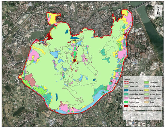 QuickBird imagery (resolution: 0.6 m) from the QuickBird satellite (DigitalGlobe Co., Westminster, CO, USA) was used as the foundational data source. The imagery was obtained from Google Earth and was captured on 13 October 2021. The imagery was projected in the WGS 1984 Web Mercator, a commonly used web-based mapping program. Based on GPS control points acquired from field surveys, highly accurate geometric corrections were applied to the QuickBird imagery using the ArcGIS 10.6 software to ensure that any errors were less than 0.5 pixels. The visible band was used to analyze the imagery, and image classification was based on visual interpretations. To ensure the accuracy of the classification map, the screen resolution was maintained within a scale of 1:1000. Field surveys and land class validation were conducted in April and May 2022, respectively. A total of 1055 GPS verification points were collected, with approximately 100 verification points for each land class. The overall classification accuracy and kappa coefficient for image interpretation were 95.25% and 0.95, respectively, meeting the research requirements.