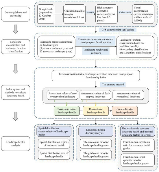 This study performed geometric corrections and visual interpretations of QuickBird satellite imagery of Xiqiao Mountain National Forest Park. Based on landscape and landscape function classifications, indicators and parameters that reflect ecological conservation, recreation, and dual-purpose functionalities were constructed. The entropy method was then applied to determine the index weights, as well as the eco-conservation, recreational, and dual-purpose landscape assessment values, which were ultimately used to generate eco-conservation, recreational and comprehensive landscape health. This study also analyzed landscape health from three perspectives: spatial distributions of landscape health, landscape health disparities, and the relationship between landscape health and internal landscape factors in forests (Figure 3).