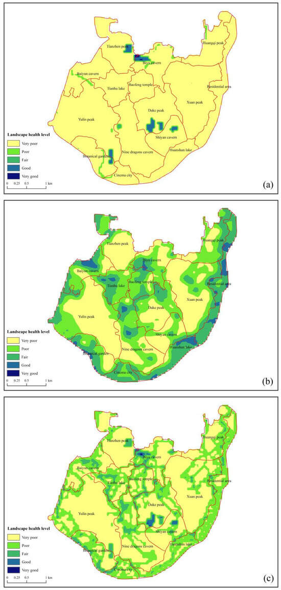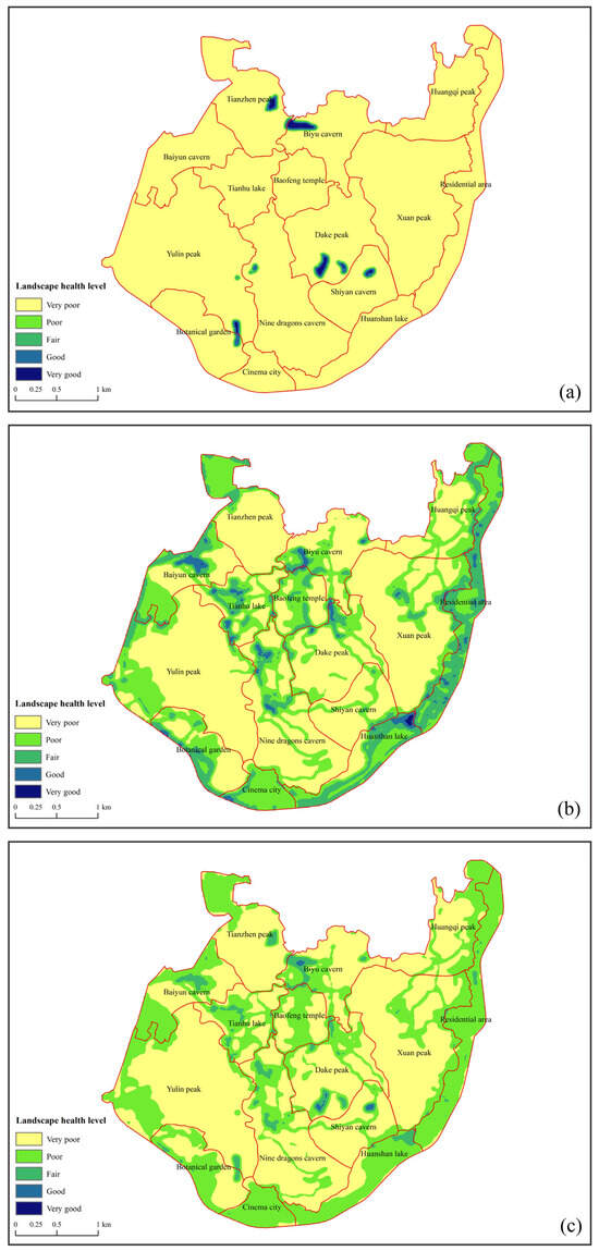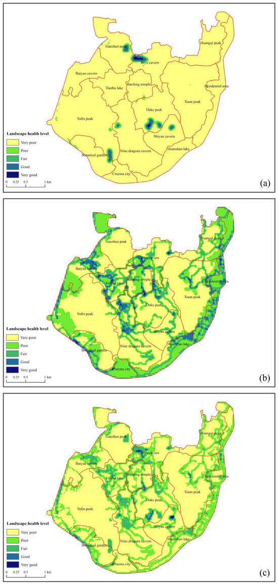 Figure 4b, Figure 5b, Figure 6b show that among the different sampling units, areas with “very good” and “good” landscape health grades for recreational functionality are primarily distributed in the central (Tianhu Lake, Baofeng Temple), central–southern (Nine Dragons Cavern, Dake Peak), and peripheral regions around the park (Baiyun Cavern, Botanical Garden, Cinema City, Huanshan Lake, residential area), occupying 6.16%, 8.08%, and 17.20% of the total area, respectively. Conversely, areas with “very poor” and “poor” grades account for 86.39%, 76.99%, and 69.46% of the total area, respectively.