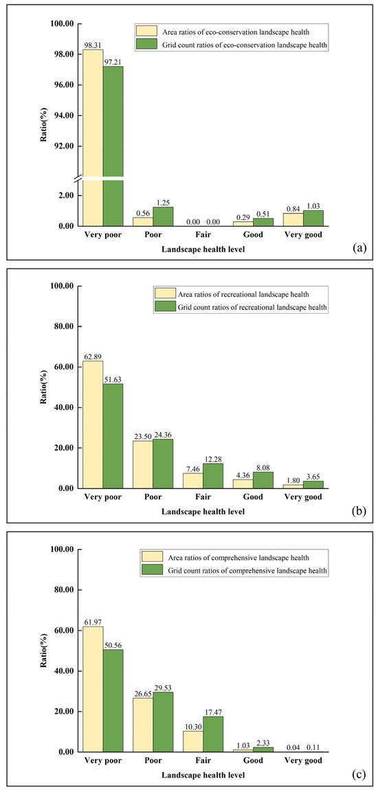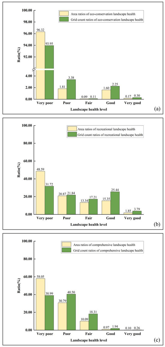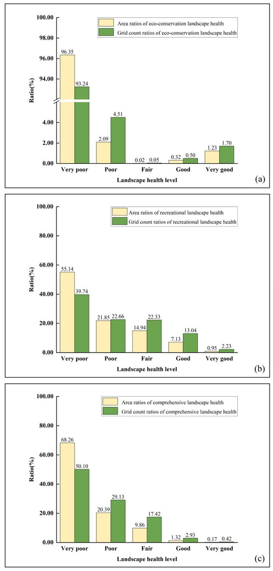 Figure 7c, Figure 8c, Figure 9c indicate that in terms of comprehensive landscape health, the total area ratio and the total grid count ratio for the “very good” and “good” grades display a trend of initially increasing and subsequently decreasing; however, the change is not significant. The total area ratio for the “very poor” and “poor” grades display a slight increase, whereas the total grid count ratio exhibits a trend of initially decreasing and subsequently increasing; however, the change is not significant in both.