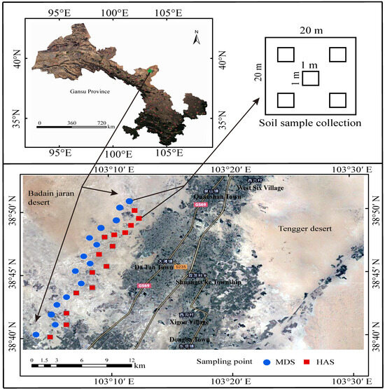 In August 2022, during the zenith of vegetative growth, field surveys were undertaken to evaluate the flora and procure soil specimens in the Laohukou Desert Control and Prevention Demonstration Area. Following a three-year effort toward artificial H. ammodendron afforestation, the sand pressure afforestation and beach afforestation areas had expanded to 6666.67 hm2 and 3066.68 hm2, respectively, by 2008. Presently, the H. ammodendron forest belt, serving as a windbreak and sand stabilizer, has attained a state of rudimentary establishment. For the purpose of this study, the soil derived from an H. ammodendron forest (HAS) that had been cultivated for a span of 15 years was designated as the experimental group, while the soil originating from the mobile dune (MDS) in the upwind direction was selected as the control group. In the H. ammodendron forest, single standardized sampling plots measuring 20 m × 20 m were randomly established at intervals of 100 m along a direction perpendicular to the principal wind direction (northwestward). A cumulative 15 standardized quadrats were established in the experimental group, wherein the stature and extent of the H. ammodendron forest in each plot were analyzed (Table 1). Correspondingly, a total of 15 (20 m × 20 m) control groups were instituted in the vicinity of the upwind region of the mobile dune soil area, perpendicular to the standardized quadrats of each experimental group (Figure 1). The 5-point technique was employed to demarcate five diminutive sample squares (1 m × 1 m) uniformly in each standardized sample plot. Surface weeds and litter were removed, and soil samples were procured from a depth of 0–20 cm in the confines of the five small sample squares. These five portions of soil were subsequently integrated thoroughly to yield a singular standardized soil sample. In the control group, 15 standardized soil samples were collected utilizing the same methodology, resulting in a total of 30 soil samples. Each standardized soil sample was promptly partitioned into two segments. Approximately 10 mL of soil sample was transferred into a sterile centrifuge tube and preserved in a refrigerator at −80 °C for subsequent soil microbial analysis. The remaining segment was subjected to natural desiccation and subsequently sieved using a 2 mm mesh to evaluate the physicochemical properties of the soil [24].