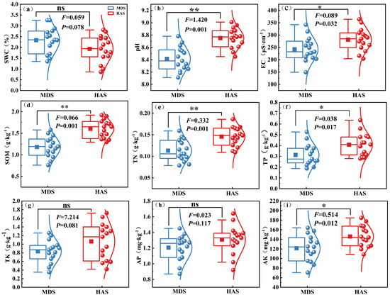 Soil physicochemical properties of H. ammodendron forest and mobile dune. Note: MDS and HAS represent mobile dune and H. ammodendron forest soil, respectively. (a): SWC, soil water content; (b): pH, soil pH; (c): EC, soil electrical conductivity; (d): SOM, soil organic matter; (e): TN, total nitrogen; (f): TP, total phosphorus; (g): TK, total potassium; (h): AP, available phosphorus; (i): AK, available potassium. “**”, “*” and “ns” indicate p < 0.01, p < 0.05 and p > 0.05, respectively. The same as below.