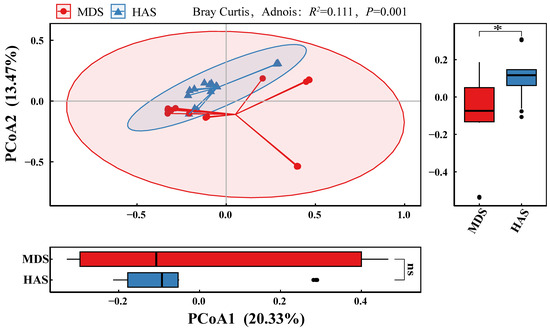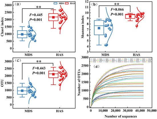 The total number of original sequences obtained from all samples of MDS and HAS was 1,714,258 and 1,796,338, respectively. The effective sequences obtained after undergoing quality control filtration and chimera removal were 1,690,381 and 1,771,937, respectively. Subsequently, the effective sequences were subjected to random sampling in order to derive representative bacterial dilution curves (Figure 3d). These curves were constructed by plotting the extracted sequences alongside the corresponding number of OTUs they represented. As the number of sequences progressively increased, the dilution curve gradually reached a plateau, thereby indicating that the inclusion of additional sequences yielded reducing returns in terms of the discovery of novel OTUs. This observation strongly suggests that the OTU coverage of the sample approached saturation, and thus, the sequencing results effectively encapsulated the entirety of pertinent microbiological information. The standardization process involved utilizing the minimum number of sample sequences, which were uniformly drawn and subsequently clustered based on a similarity threshold of greater than 97%. This procedure yielded a total of 46,187 OTUs across all samples. Notably, there was a significant difference between the mean number of OTUs observed in the HAS group (2110) and the MDS group (969) (p < 0.01). Moreover, the mean Chao1 and Shannon index values for the HAS group were 2158 and 9.34, respectively, while the corresponding values for the MDS group were 979 and 7.27, respectively. These differences were also found to be statistically significant between the two groups.