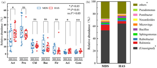 All 16S rRNA sequences were subjected to comprehensive annotation, resulting in the identification of a total of 27 bacterial phyla. Among these, there were seven bacterial phyla exhibiting a relative abundance of >1% (Figure 5a). The bacterial community structure observed in the MDS and HAS plots exhibited similarities, albeit with notable differences in relative abundance. Notably, Actinobacteria, Proteobacteria, and Chloroflexi emerged as the top three bacterial phyla in terms of their relative abundance in the soil of the study area. Their respective average abundances were 24.94% ± 11.85%, 29.99% ± 11.56%, and 11.14% ± 4.55%. Additionally, the cumulative abundance of Bacteroidetes, Firmicutes, Acidobacteria, and Gemmatimonadetes reached 21.12%, thereby establishing their prominence as major bacterial phyla in the soil of the H. ammodendron forest. Notably, the abundances of Actinobacteria, Acidobacteria, and Gemmatimonadetes exhibited a significant increase in the HAS plot (p < 0.05). Conversely, the abundances of Proteobacteria and Bacteroidetes experienced respective decreases of 11.95% and 12.69%. At the genus level, a significant proportion of bacterial genera, amounting to 82.37%, eluded classification and exhibited a relative abundance of less than 1%, thereby presenting certain impediments to the comprehensive analysis of bacterial ecological functions. Moreover, a total of eight distinct categories of bacterial genera were identified (Figure 5b). The relative abundance of these aforementioned genera displayed an evident pattern across the two groups of plots. Specifically, in comparison to the MDS group, the relative abundance of Rubrobacter, Sphingomonas, Bacillus, and Microvirga in the HAS group experienced a significant increase of 53.53%, 34.52%, 124.7%, and 13.19%, respectively. Conversely, the relative abundance of Ralstonia, Nocardioides, Pontibacter, and Pseudomonas witnessed a decline of 57.29%, 19.35%, 55.47%, and 51.47%, respectively, in the HAS group when compared to the MDS group.