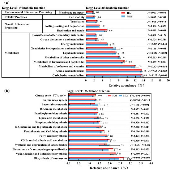Prediction of the metabolic functions of soil bacteria. Metabolic functional pathways in HAS and MDS soil bacteria; (a,b) denote secondary and tertiary metabolic pathways. “**”, “*” and “ns” indicate p < 0.01 and p < 0.05 and p > 0.05, respectively.