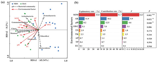 (a) RDA analysis of the effect of soil physicochemical factors on soil bacterial community structure; (b) explanation and significance test of soil physicochemical factors. ** p < 0.01, * p < 0.05.