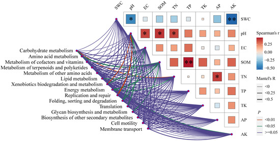 Mantel test of the effect of soil physicochemical factors on soil bacterial functions. ** p < 0.01, * p < 0.05.