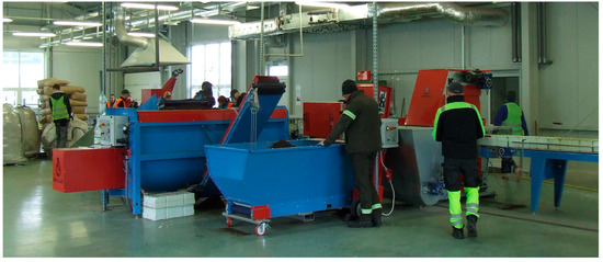 Before filling the containers, the substrate was moistened in a line mixer equipped with spray nozzles. Moisture was organoleptically controlled during the moistening process by the line staff. They adjusted the moisture of the substrate to the level typically used when filling containers. For the experiment, after moistening and while refilling the line’s buffer tank, 12 substrate samples were taken (comprising four series of three samples each). Their moisture content was determined in % on a WPS 110 dryer scale, accurate to ±0.1%. The moisture content of the substrate when filling V150 containers was 75.7 ± 1.1%, and for V300, it was 75.9 ± 2.1%. The vibration intensity of the vibrating table remained constant during the filling, regardless of the container type. This amounted to 12.0 G of maximum acceleration, measured using the Voltcraft DL-131G device, with an accuracy of ±0.5 G [18]. Throughout the tests, the line’s efficiency remained consistent, set at E = 400 (containers·h−1), which is the typical rate at which containers are filled at this nursery. The operating parameters of the line, containers and substrata, were the same as those used in the experiment performed earlier [19].