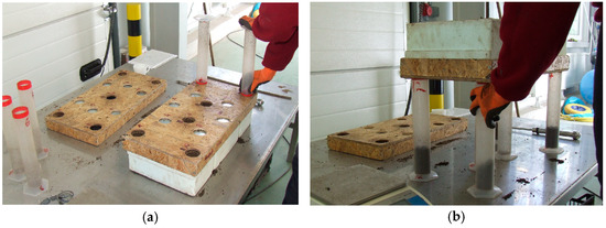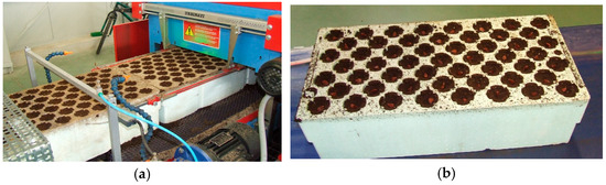 During the testing material preparation, 10 V150 containers were initially filled to stabilize the line’s operating conditions. Subsequently, another set of 10 V150 containers were filled. From this set, the first four containers were used for bulk density (BD) measurements, the next two were designated for outflow measurements on the prototype station, and the last four were used for density measurements (BD). When the line was transitioned to filling V300 containers, 10 containers were filled to stabilize the operating conditions. The subsequent 10 V300 containers measured similarly to the V150. For volumetric density measurements, containers had a collector placed on their upper surface. This collector had either six holes for V150 or five for V300 containers. These holes were evenly distributed on the surface of the container (positioned diagonally and in the middle of the longer sides of the containers). Volume cylinders, with a 500 mL capacity, were inserted into these holes (Figure 4a). Subsequently, the container, with the collector, was rotated 180 degrees. This action caused the contents of selected cells (substrata) to spill out into the cylinders (Figure 4b). The cylinders into which the substrate from a single cell fell were weighed to determine the mass of the wet substrate in individual cell mw [g]. Knowing the volume of a single cell V (cm3) (Table 1) and the mass of the substrate mw, the actual ABD (g∙cm−3) of the substrate in selected cells of the V150 and V300 containers was calculated. Then, the substrate collected from individual cylinders was dried at 65 °C for 48 h to obtain the dry mass md (g), and taking into account the cell volume V (cm3), the dry bulk density DBD (g∙cm−3) was determined.
