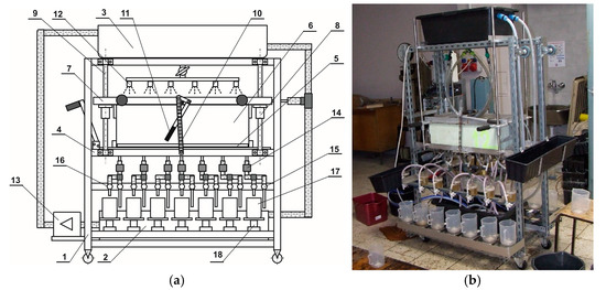 Prototype station for measuring the rate of water leakage from a nursery container [18], diagram of the station (a); measurement in the container (b). Photo: M. Kormanek 1—main frame, 2—lower tank, 3—upper tank, 4—fixed frame, 5—drain plate, 6—container, 7—movable frame, 8—linear bearings, 9—guide rollers, 10—compression springs, 11—lever mechanism, 12—spray nozzles, 13—pump, 14—settling filters, 15, 16—solenoid valves, 17—measuring containers, 18—strain gauge sensors. Figure and photo: M. Kormanek.