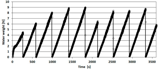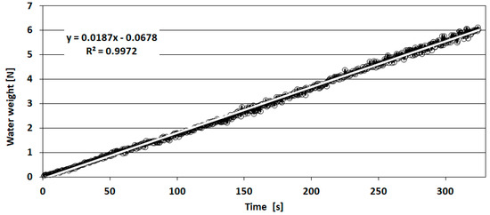 Figure 5 illustrates the changes in the weight w of the liquid over time t (60 min) for three cells of the V150 container as measured at the prototype station. Figure 6 shows the course for the first cycle of filling the measuring container (spanning about 6 min). Accompanying this is a straight line that represents the rate of weight increase as a function of time, denoted as the difference quotient W.