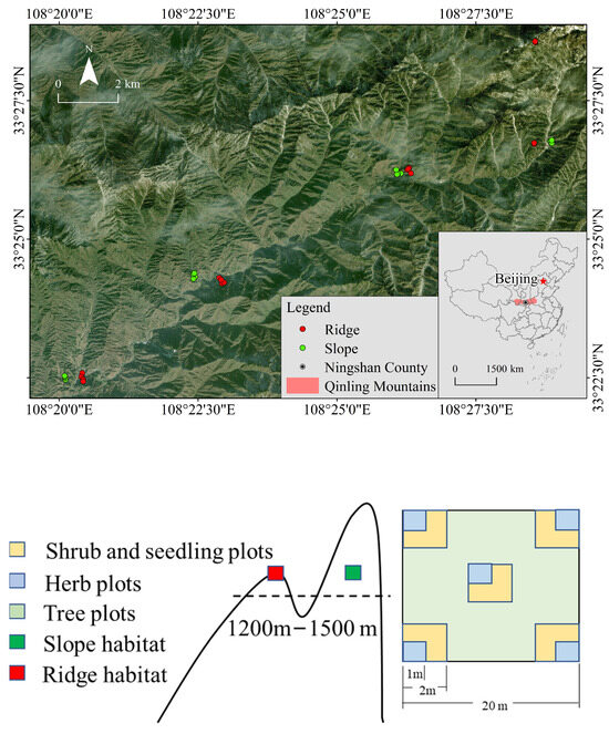 The Chinese pine (Pinus tabuliformis) is one of the most widely distributed native conifer species in northern China and plays essential roles in soil and water conservation and biodiversity maintenance in temperate forest communities. The distribution areas of Pinus tabuliformis gradually decrease along the Qinling Mountains from west to east, with Huoditang, Ningshan County, on the southern slope of the mid-Qinling Mountains representing one of the most important areas where the species presents a dense distribution [30]. Zhu [31] and Xu [32] found that most Pinus tabuliformis individuals were zonally distributed on ridges or had small-area patches inlaid on the oak forest of the slope habitats, forming pine–oak mixed forests. Recent studies have focused on the community type, diversity, regeneration, and spatial pattern of stands in different environments to understand the status of the Pinus tabuliformis community [33]. Within such studies, focus has been placed on species characteristics such as functional traits [34], seed dispersal [35], tree growth response to climatic factors [36], and composition and diversity of ectomycorrhiza [37], while the driving factors of Pinus tabuliformis populations in ridge habitats and the adaptability characteristics of the species have been largely ignored. The distribution pattern of the Pinus tabuliformis population in Huoditang holds particular promise for the exploration of its distribution drivers and adaptability, as its population characteristics are shaped by large changes in terrain and associated environmental conditions over a relatively small area.