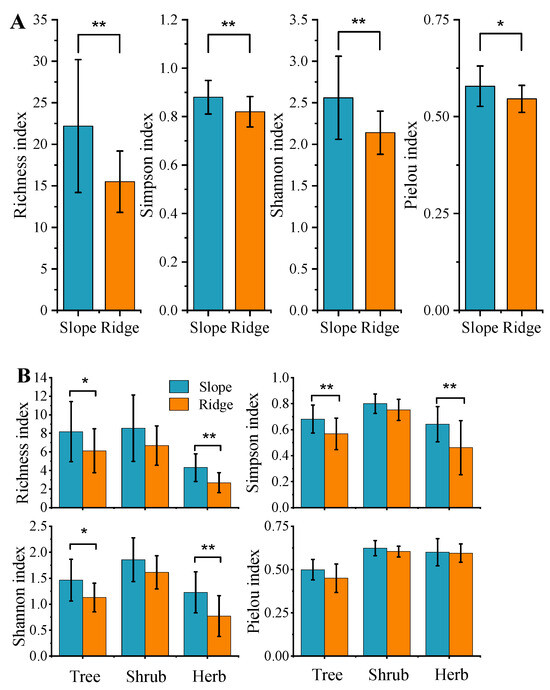 Species diversity of Pinus tabuliformis community at different habitats. “*” indicates the index differing significantly between two habitats (p < 0.05), “**” indicates the index differing by an extreme amount between two habitats (p < 0.01), and the error bars show the SD of the means. (A,B) indicate all species diversity and species diversity of each layer.