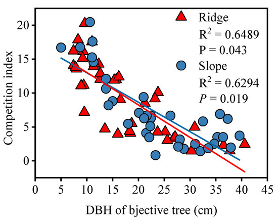 Hegyi’s single-tree competition index model was used to quantitatively analyze the intra- and interspecific competition intensities within the Pinus tabuliformis population. A total of 40 and 46 object woods and 739 and 1081 competitive woods were investigated in the slope and ridge habitats, respectively, and the proportion of other tree species in the ridge habitat (32.3%) was lower than that in the slope habitat (38.6%), indicating that intraspecific competition dominated the Pinus tabuliformis community in the study area. The competition index of the Pinus tabuliformis population in the ridge and slope habitats decreased with increasing DBH (Figure 3).