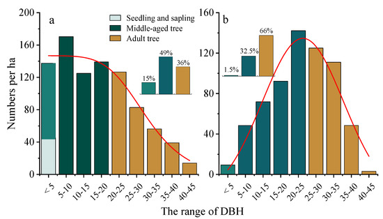 DBH structure of Pinus tabuliformis population in different habitats. (a) Ridge habitats and (b) slope habitats.