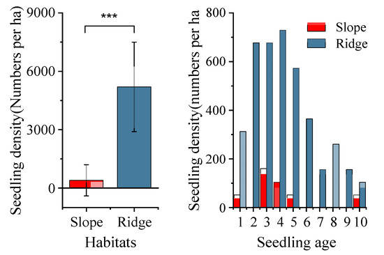 Seedling density and age structure of Pinus tabuliformis in slope and ridge habitats. “***” indicates the index differing by an extreme amount between two habitats (p < 0.001).