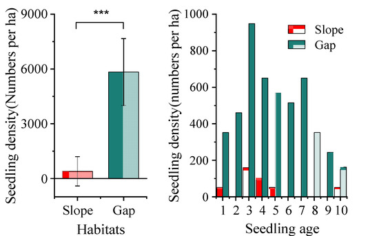 Seedling density and age structure of Pinus tabuliformis in slope and gap habitats. “***” indicates the index differing by an extreme amount between two habitats (p < 0.001).