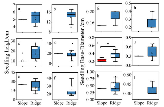 Seedling height and base diameter comparing each age of Pinus tabuliformis between slope and ridge habitats. (a–l) represent ages 1 to 6, “*” indicates the index differing significantly between two habitats (p < 0.05).