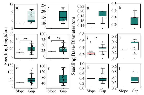 Seedling height and base diameter comparing each age of Pinus tabuliformis between slope and gap habitats. (a–l) represent ages 1 to 6, “*” indicates the index differing significantly between two habitats (p < 0.05), “**” indicates the index differing by an extreme amount between two habitats (p < 0.01).