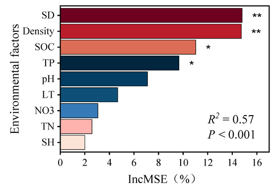 Based on the stepwise multiple regression model results, the shrub density, canopy density, and SOC were entered into the interpretation model for seedling density. The model was significant (Adj-R2 = 0.68, p < 0.001) and was determined as:
