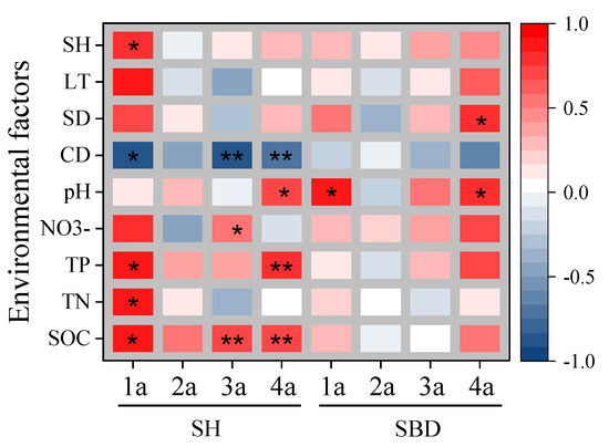Relationship between seedling growth and environmental factors. “*” represents significant correlation (p < 0.05), “**” represents an extremely significant correlation (p < 0.01), and the absence of a symbol indicates absence of significant correlation. 1a–4a represent ages 1 to 4 years. SH: seeding height, SBD: seedings base diameter.