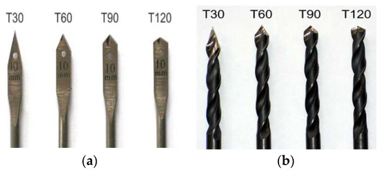 Eight drill bits with 10 mm cutting diameter were used: 4 flat drill bits (rake angle γ = 0°) and 4 twist (helical) drill bits. They had different tip angles (2κr = 30°, 60°, 90°, and 120°). The selected drills are presented in Figure 1. The clearance angle of the drills was α = 20°. The drills used were coded with symbols according to the tip angle: T30, T60, T90, and T120.