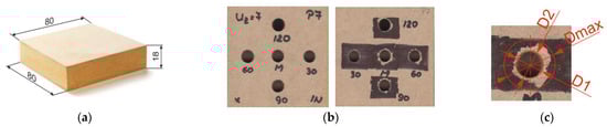 The 80 samples used for the experiments were cut from an 18 mm-thick MDF board. They had a square shape with dimensions of 80 × 80 mm (Figure 2a).