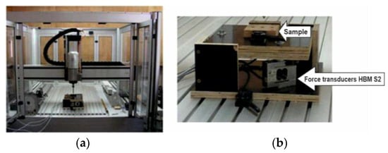 The machine used for drilling was an ISEL GFV/GFY numerically controlled machining center (Figure 3a). A device with three HBS S2 force transducers (nominal force 500N) was used to measure the thrust force (Figure 3b).