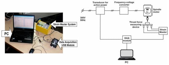 The drilling torque was determined indirectly. Initially, the active electrical power consumed by the spindle motor was measured. A Sineax P530/Q531 (Camille Bauer) active/reactive power transducer was used. A Keithley Model KUSB-3108 DAQ board was used for data recording. Figure 4 shows the equipment used for measurements and the connection diagram.