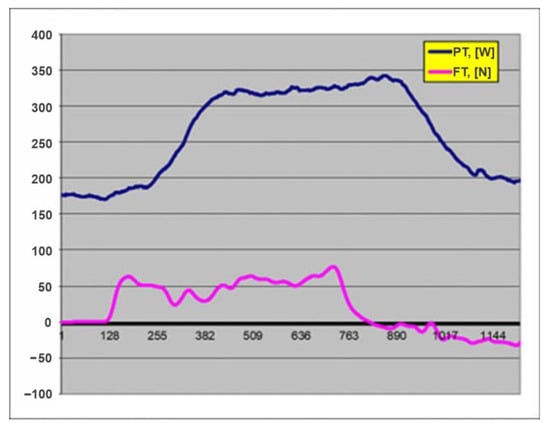 A quick look at Figure 5 and Figure 6 would give the impression that the power and force signals are not synchronized. This could be a sign that the equipment was faulty or that the measurements were affected by errors. In fact, this is not the case. The equipment was checked, and several tests were performed that showed that the equipment was in good working condition. However, a careful analysis of the data shows that the two signals are not out of phase, but that the power increases more slowly (less steeply) than the thrust force, even very slowly in the first moments after the drill touches the test piece. The physical explanation of the phenomenon can be attributed with certainty to the fact that the rotor of the working spindle acts as a flywheel, having a high inertia due to its high mass and high speed. As a result, the electric power absorbed from the grid by the electric motor (in order to sustain the spindle rotation) increases more slowly and gives the impression of a desynchronization of the measured signal (lag behind).