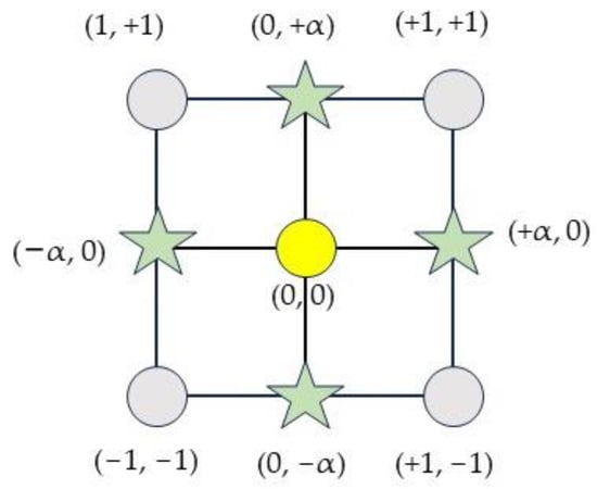 Figure 7. The representation of a face central composite design and the analyzed combinations among factors (−1 is the low level of factor; +1 is the high level of factor; 0—is the middle value of factor; and ±α is the axial or star points).