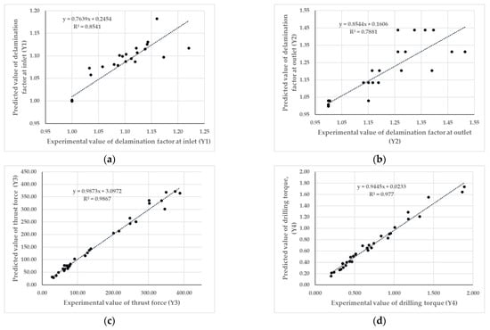 A comparison between the predicted and experimental responses: (a) delamination factor at the inlet; (b) delamination factor at the outlet; (c) thrust force; and (d) drilling torque.
