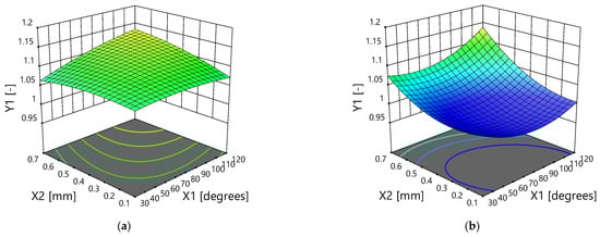 By comparing the factor coefficients of Equation (7), one could observe that drill type (X3) has a bigger influence than the drill tip angle (X1) and tooth bite (X2). This result is contrary to the results obtained in the case of prelaminated particleboards, where the most important factor that affects the delamination factor at inlet (Y1) is the tooth bite []. This result is correlated with data reported in the literature; namely, the feed rate and drill tip angle play an important role on the value of delamination factor [,,,,]. In addition, in this study, it was found that there is an interaction between the independent variables. The most important interaction is between drill tip angle and drill type (X1X3) and between tooth bite and drill type (X2X3). Since there is a non-linear effect on the drill tip angle and tooth bite factor, the optimum values are inside the analyzed range (Table 1). The ANOVA results (α = 0.05) are presented in Table 7. In Figure 10, the influence of the drill tip angle (X1) and tooth bite (X2) on the delamination factor at the inlet during MDF drilling can be observed.