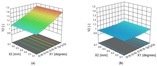 The regression equations obtained for the delamination factor at outlet (Y2) are presented by Equations (10)–(12). The models are significant at 1%. Based on Equation (9), one could observe that the most important factor that influences the delamination factor at outlet is the drill type (X3), which is similar with that obtained in the case of the delamination factor at inlet. The second factor is the drill tip angle (X1). The third one is the tooth bite (X2). Moreover, the results are similar with data reported in the literature; namely, a small tip angle with a low feed rate assures a lower delamination factor during drilling of MDF []. The most important interaction is between drill tip angle and tooth bite (X1X2). By comparing the results regarding the most important factor that affects the delamination factor at outlet during drilling of MDF boards, one could observe that the obtained result is the same as that obtained in the case of prelaminated wood particleboards []. The ANOVA results (α = 0.05) are presented in Table 8. In Figure 11 is presented the synergetic effects of the drill tip angle (X1) and tooth bite (X2) on the delamination factor at the outlet (Y2).