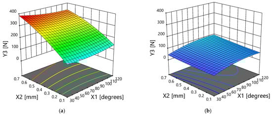 The regression equations that can be used to predict the thrust force (Y3) are shown in Equations (13)–(15). The most important factor that influences the trust force during the drilling of MDF boards is the same as in the case of prelaminated wood particleboards, namely drill type []. The second one is the tooth bite and drill tip angle. The results are supported by the data in the literature, namely that the thrust force is affected by the feed rate [,]. The interaction between tooth bite and drill type has a bigger effect than the others, namely between tooth bite and drill tip angle or the interaction between drill tip angle and drill type. This interaction is pictured in Figure 11. The ANOVA results (α = 0.05) are presented in Table 9. In Figure 12 is presented the interaction effects of the drill tip angle (X1) and tooth bite (X2) on the thrust force (Y3).